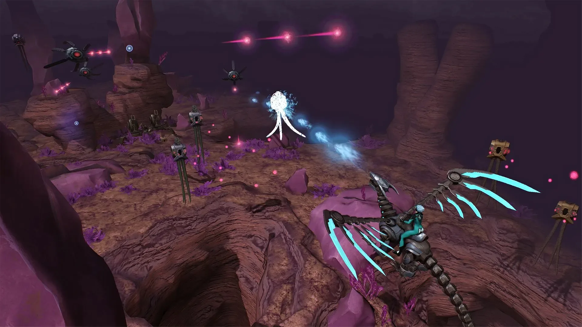 Danger Forever is 3D Shoot'Em Up with RPG elements. Lone human rides her mecha-dragon through a hostile world of mechanoids and techno-demons. Unlike most scrolling shooters, you fly through a 3D environment — use it to your advantage, and beware of bumping into walls or ground. Also, instead of traditional showering enemies with bullets, you must think ahead a bit - the fuel/heat system adds more depth to combat.