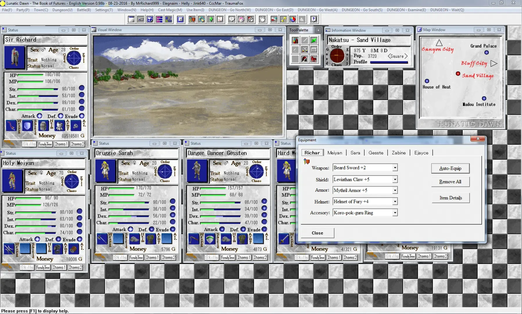 Lunatic Dawn - Book of Futures is an RPG Windows PC game released by Artdink. You can be a hero or a villain depending on what tasks you wish to undertake. You can also smuggle, kidnap, assassinate, rescue, kill monsters, deliver items, and more. The game offers non-linear game-play where you can roam as you please in a randomly generated world with each game-play. The game also has Medieval Japan, Arabian, and Medieval European styled environments where you can start from or travel to. You can also recruit your own party members from each area as you wish also. If you are looking for a different type of RPG where you can play as you want, this is a must try.