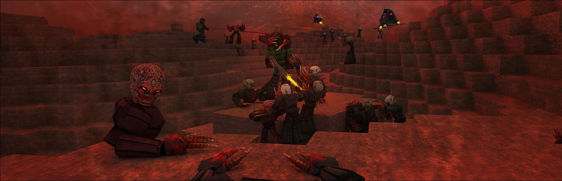 Halo-inspired. Compete in classic Deathmatch & CTF or be the zombie in Infection & devour corpses to level up. Vehicles. Destructible & constructible environments. Zombie survival.