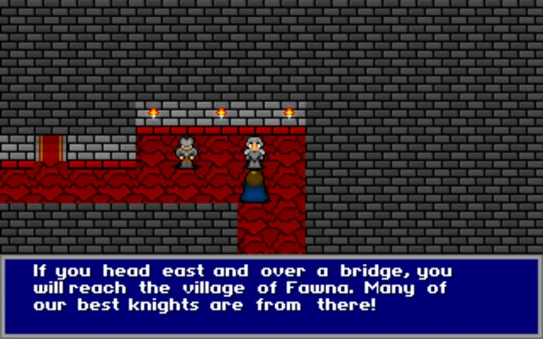 Mysterious Song is an RPG strongly influenced by the style of the early Final Fantasy games. Your character is a knight, sent by the king to investigate the trouble arising in the land, with the help of two other party members whom you pick up as you travel. The combat is turn-based, with a very simple magic system based on spell points. One party member is a mage, one specializes in physical combat, and your main character is a mix. There is no class selection, only leveling up.