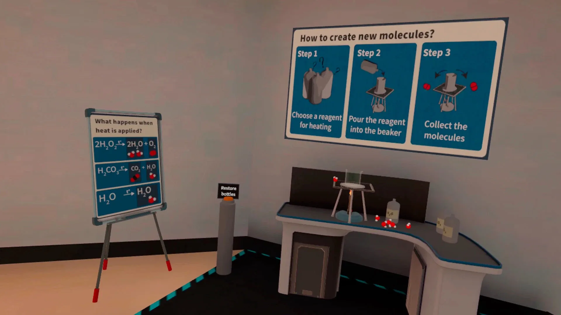 Escape the room using your chemistry knowledge! Explore the clues lying around. Clear up the poisonous gas blocking your exit. Turn a toxic combustion reaction into a regular combustion reaction. Heat up different liquids to obtain the needed molecules.