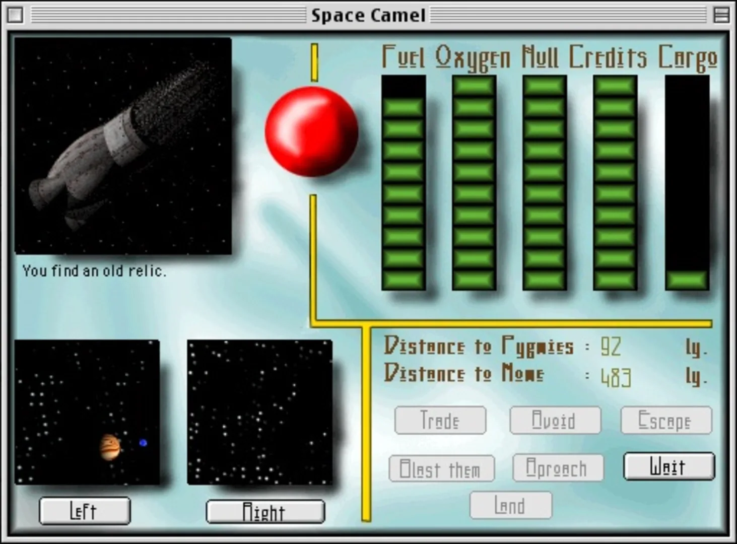An interstellar rendition of Camel or Desert Trek. Keep an eye on the air, fuel, and hull meters!