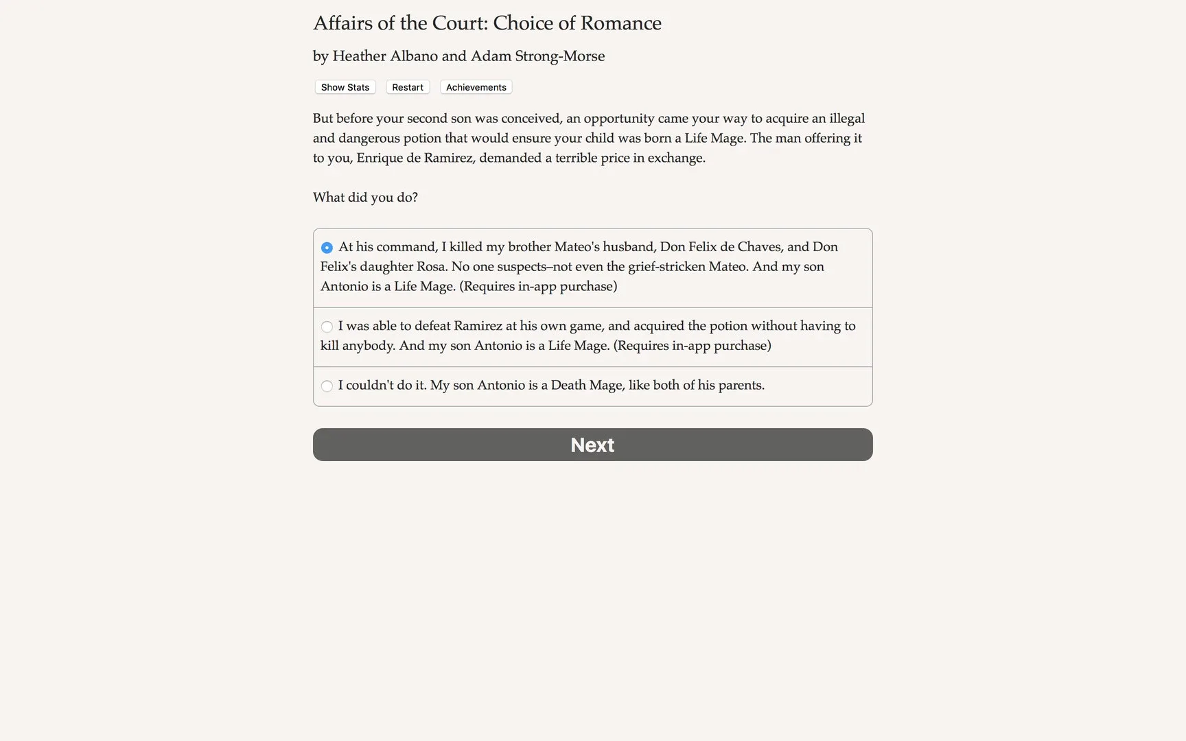 If you start a new game beginning in Episode 3: 'Til Death Do Us Part, this option unlocks the ability to make your son Antonio a Life Mage, putting him in line to inherit the throne.