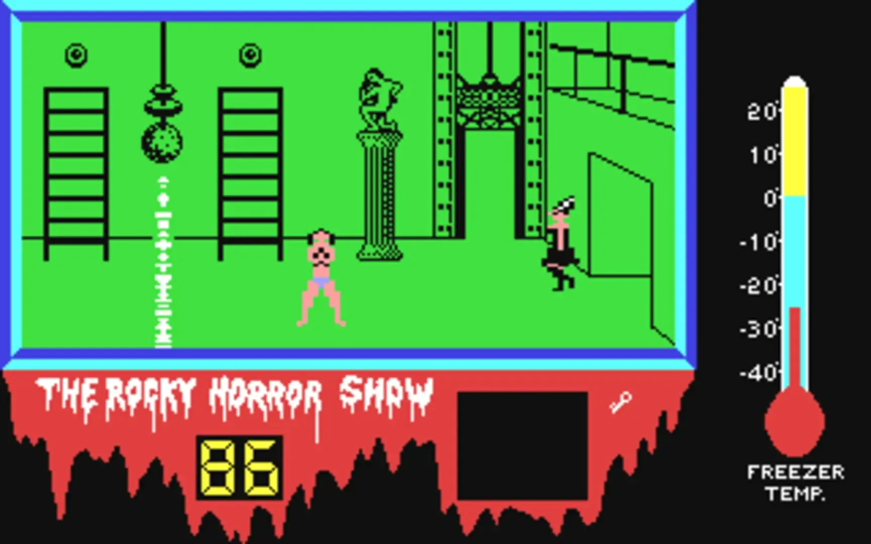 The Rocky Horror Show Computer Game is a 1985 video game for the Commodore 64, Commodore 128, ZX Spectrum and Amstrad CPC created by the CRL Group PLC. The game involved playing as either Brad or Janet and collecting pieces of the Medusa machine scattered around the castle, in order to free your partner from stone and escape the castle before it blasts off. Meanwhile, the other characters in the game can hinder your progress by stealing and hiding your clothes along with what you are carrying. Riff-Raff can kill the player with his laser gun, and Eddie can run the player over with his motorcycle should he thaw out and escape from his freezer.