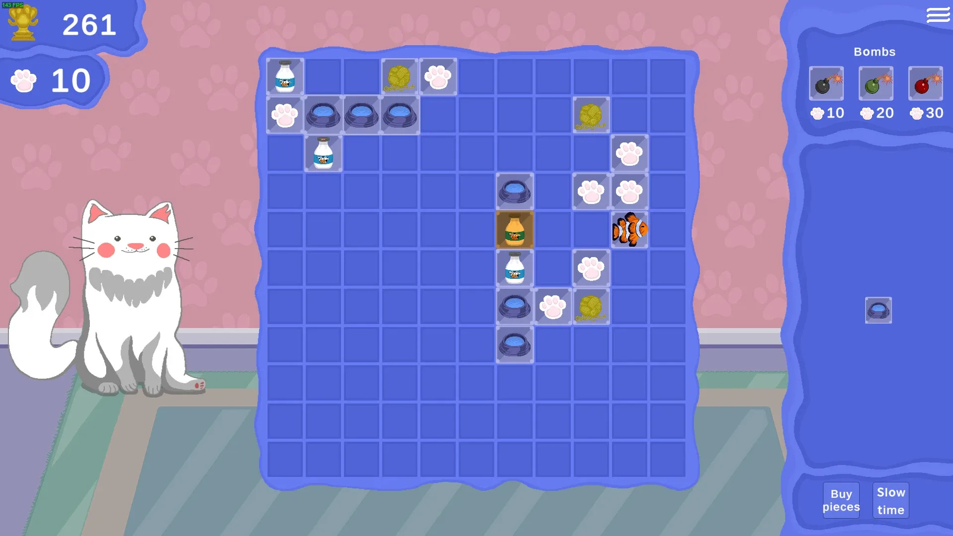 Take care of Cato using a match 3 mechanic and don't let him get away. The player needs to take care of Cato, a very smart cat, through a match 3 mechanic to prevent Cato from running away. Feed, hydrate and of course play a lot with Cato so he won't run away. Play to relax or to get the best scores.