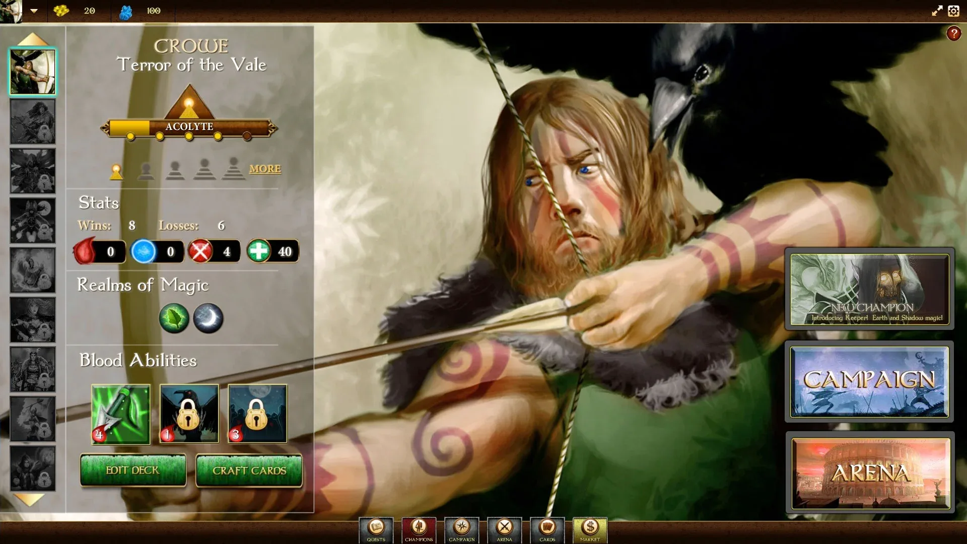 BloodRealm combines all of the strategy and depth of a traditional collectible card game experience with the convenience of online gaming. Build your own decks to play against your friends, compete in online tournaments, and explore a rich fantasy world in a single-player campaign mode. BloodRealm places you amidst the eternal warring of the gods. The covenant which decreed that the gods would respect the free will of mortals was broken by the powerful sun god Ra, who consumed a mortal mind to serve him as champion, leading his armies into war. That champion is you; the game begins when you shrug off the mental bondage of Ra, an act so cataclysmic that reality broke, and all of the gods the heavens bore fell to the Earth. The gods are desperate to restore their immortality and regain their place at the zenith of the world. Only you possess the strength of will powerful enough to stop history repeating and end their tyranny once and for all. Can you make your own miracle and kill the gods? There are Six Realms of Magic in BloodRealm: Chaos, Order, Nature, Myth, Shadow and Light. Each Champion has access to 2 of these Realms in building a deck composed of powerful ally and spell cards. Champions also have a special unique 'Blood' ability, with additional Blood powers unlocked as they Ascend to become Gods themselves. The free download of BloodRealm provides each player with the choice of one of three Champions, its starting Deck of Ally and Spell cards, 1000 Gold, and 36 single-player Campaign battles (each with 3 levels of difficulty). Additional Champions, single-player Campaigns, and card packs may be purchased using Gold, which may be earned by playing the game or by spending real currency.