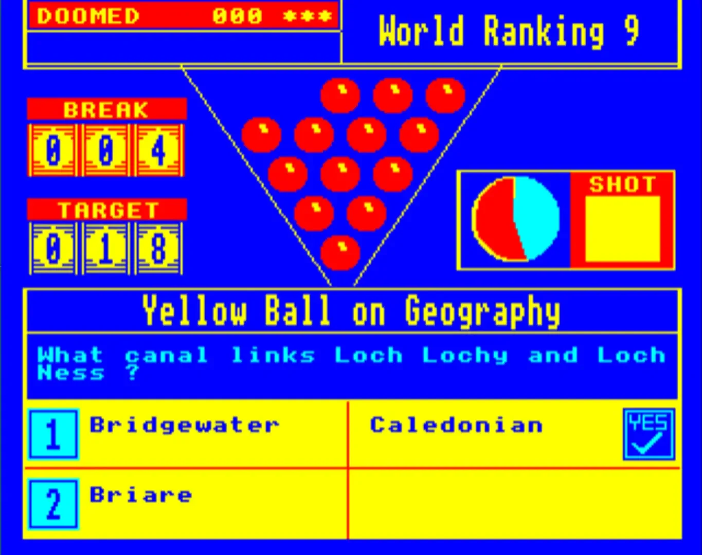 Master Break is a snooker themed quiz game that can be played by up to four players. In a single player game the aim is to get the highest break (up to a maximum of 147) while the multi player game is simply about getting the highest score. The player starts with a red ball question and the player has to answer by choosing one of three alternatives before time runs out. After that the player can choose between balls of different colours with different subjects. There are six categories of questions: science & nature, pop music, geography, sports & pastimes, art and history. Each player can pass up to three red questions. In a multi player game an "over pocket" sign might appear and answering wrong will then lead to a foul shot. Foul shots lead to the opponents being awarded points.
