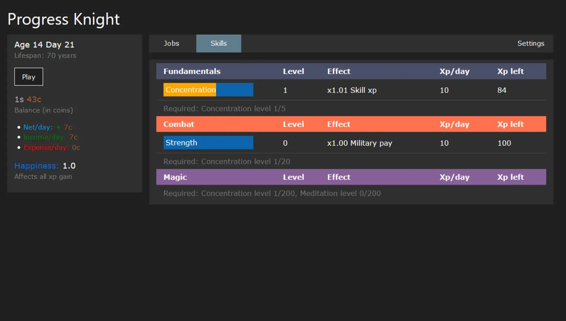 Progress Knight is a life-sim incremental based in a fantasy/medieval setting, where you must progress through the career ladder and acquire new skills to become the ultimate being. You first start off as a beggar, barely being able to feed yourself as the days go by. However, over the years you learn new skills and gain plenty of work experience to enter new high paying jobs while managing your living expenses...