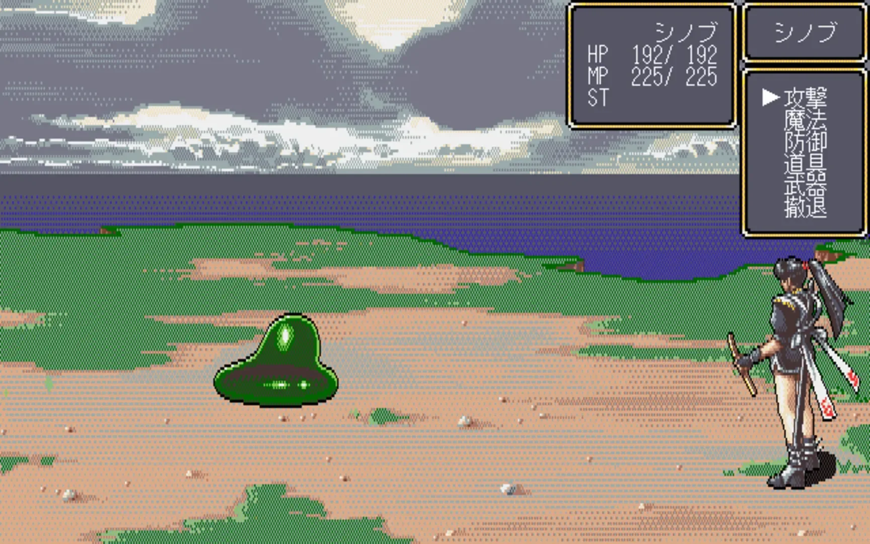 Kuro no Ken is a rather standard Japanese-style RPG with all the familiar ingredients: top-down locations, navigation on the world map, random enemies, turn-based combat, automatic leveling up, etc. The battles are viewed from a third-person perspective, using much larger character sprites than during exploration. Shinobu and Kayes can use physical attacks or magic spells (learned automatically when leveling up), which deplete MP.