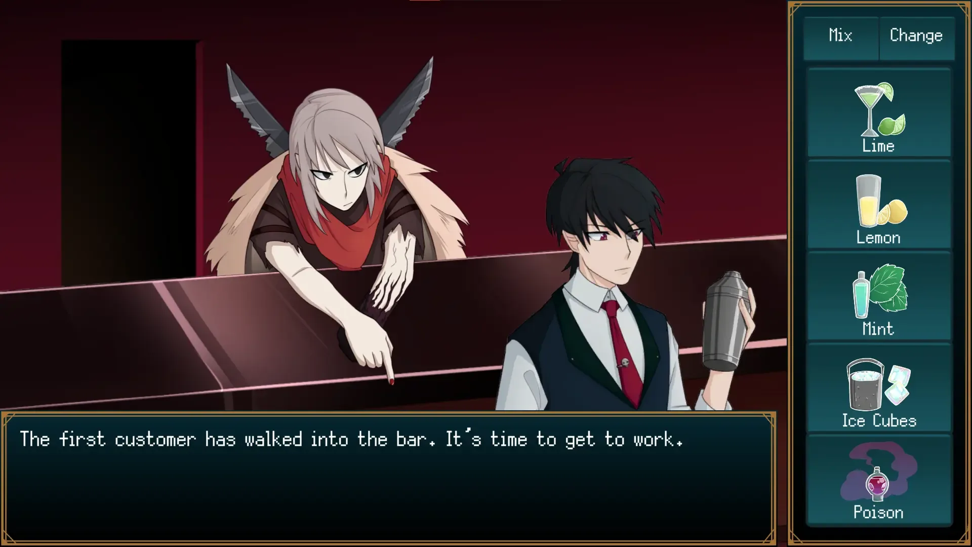 You play as a bartender named Felix. Felix makes cocktails for his unusual customers and converses with them. Mostly, he just listens and lets them do all the talking. Help Felix make the right drinks to please his customers and possibly change their moods.