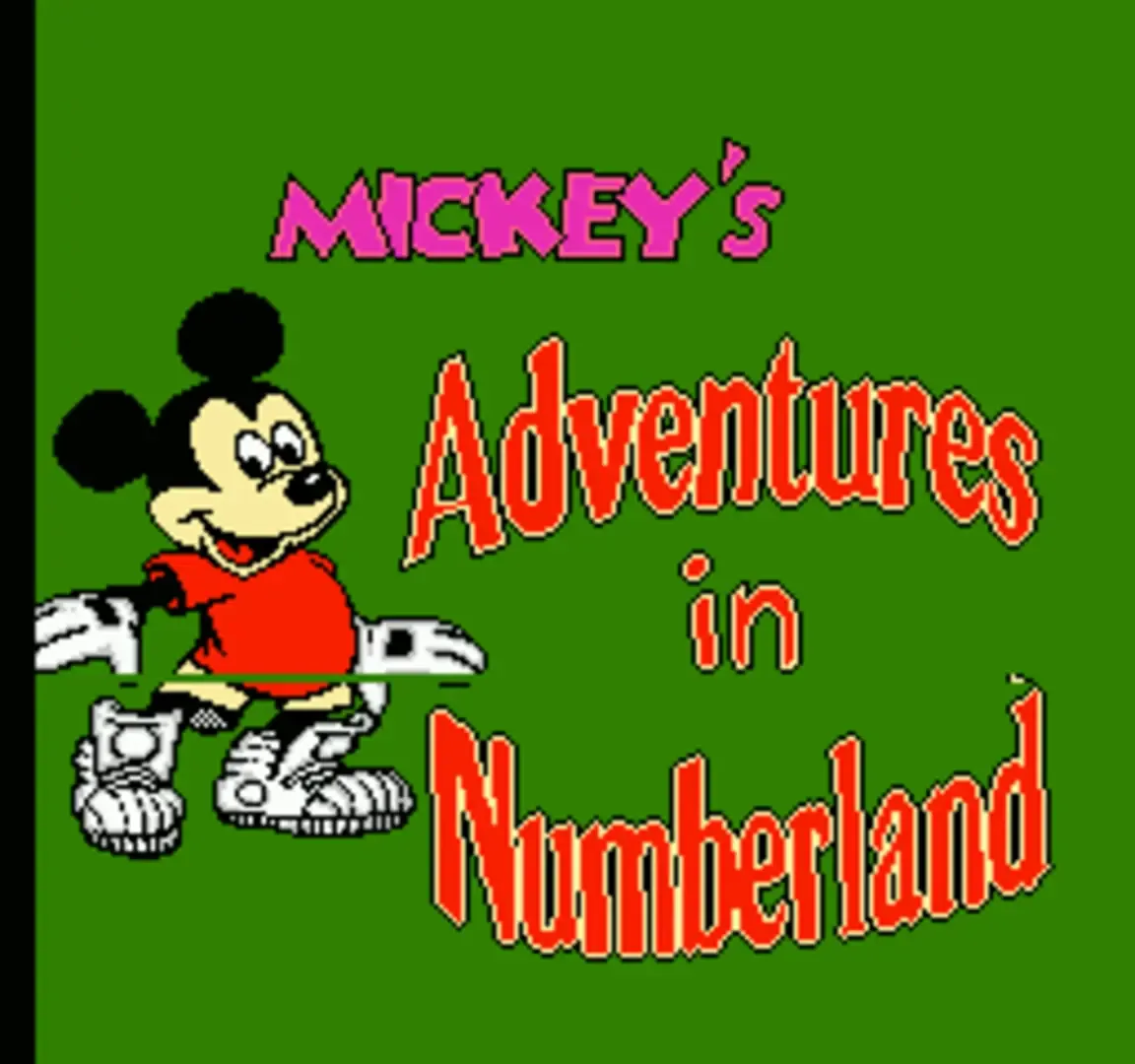 "Oh no", cried Donald the Sheriff. "Pete's done it again!" "He's stolen our numbers-from 1 up through 10!" "Search the whole city-every street every house." "Look high and low-and call Mickey Mouse!" "You can count on me," declared Mickey Mouse. "Don't worry!" "I'll find all the numbers. I'll foil Pete's plot!" "I'm set for adventure. I'm hot on the trail." "With my friends to help guide me, there's no way I can fail!" Immensely entertaining, Mickey's Adventure in Numberland helps improve early number identification and counting skills as it invites children to join Mickey on his quest to locate and return Numberland's stolen numbers. The game features 5 imaginative worlds of fun and fantasy-each with two levels and a seemingly endless supply of animated surprises. Mickey's Adventures in Numberland is an educational game released for the NES in March of 1994.