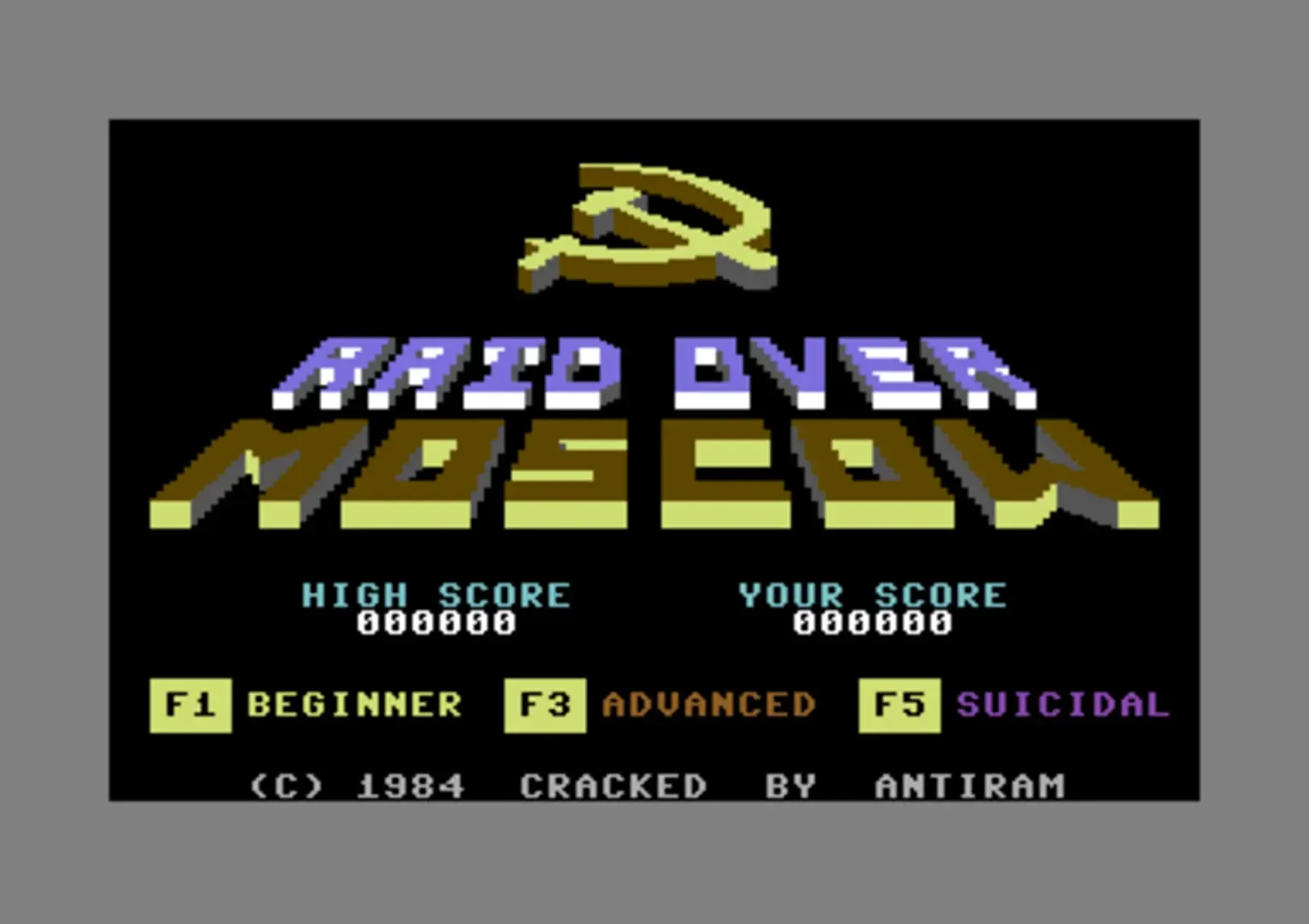 Released during the Cold War era, Raid Over Moscow is an action game in which the player (an American space pilot) has to stop three Soviet nuclear attacks on North America, then fight his way into and destroy a nuclear facility located in Moscow's Kremlin. According to the game's storyline, the United States is unable to respond to the attack directly due to the dismantlement of its nuclear arsenal.