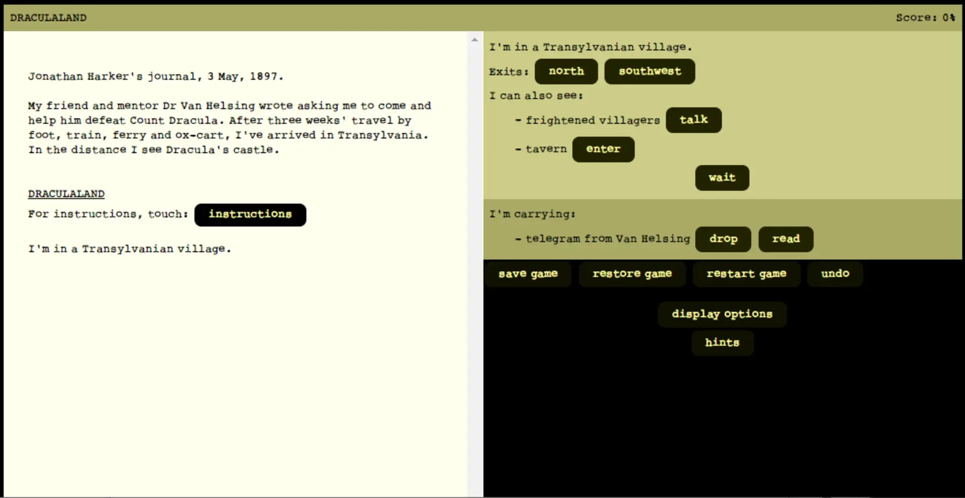 A text adventure adaptation of Dracula, faithfully reimagining several characters and ignoring most of the original plot. Guide Jonathan Harker on a trip through Transylvania, interacting with vampires, mad scientists, zombies, annoying magpies, and moustachioed werewolves. Uses a mobile-friendly clickable text interface.