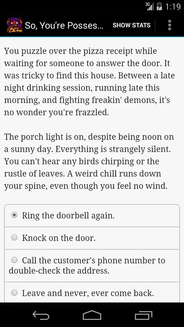 So, You're Possessed! is a 50,000 word contemporary fantasy novel where your choices impact how the tale unfolds. It's entirely text-based - without graphics or sound effects - and fueled by the vast, unstoppable power of your imagination. Will you nurture friendships or fight your demons alone? Should you keep your dark side contained? Can you unlock all 26 achievements?