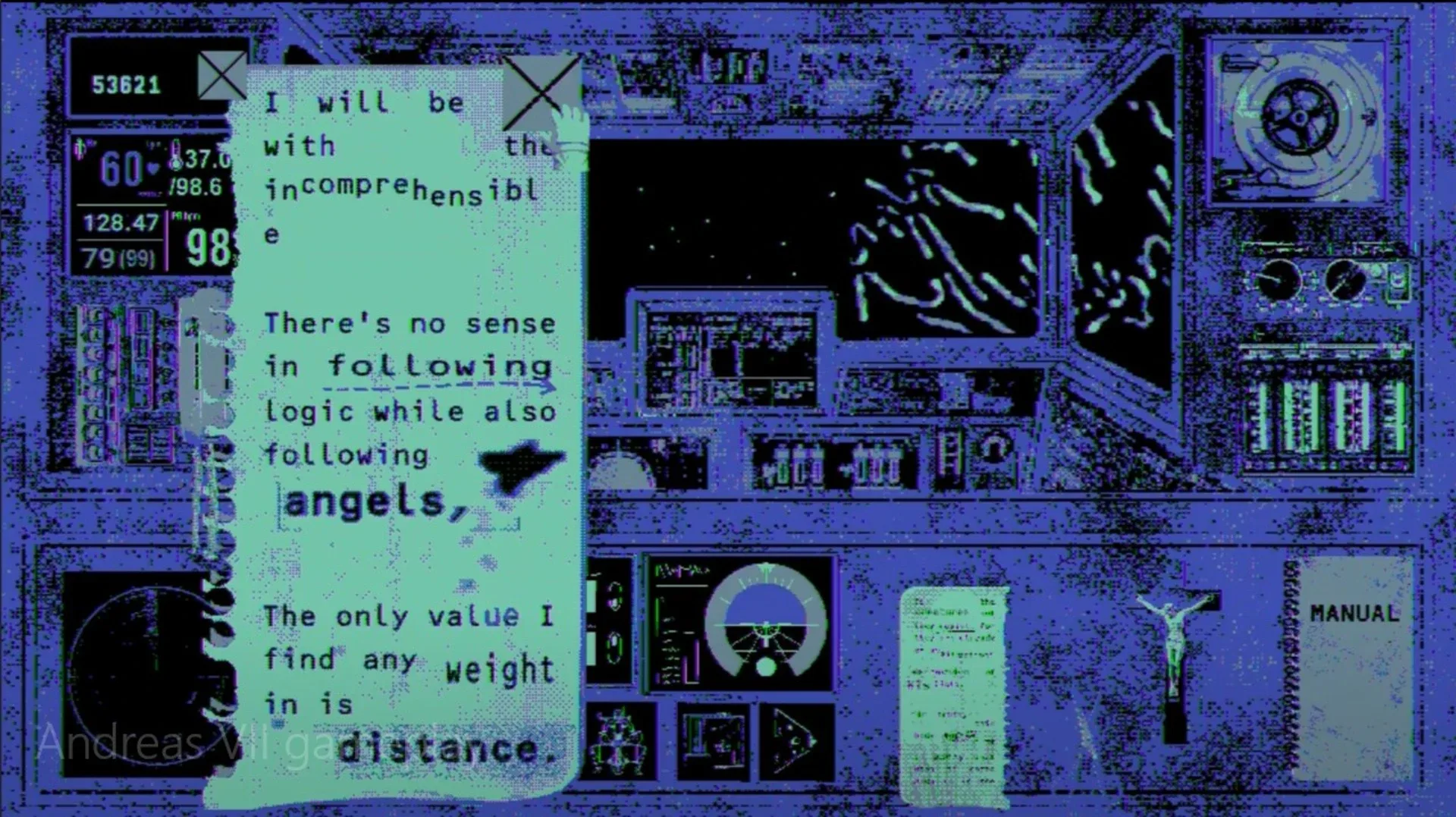 Inspired by the works of Yames, Andreas VII is a puzzle centered talking-sim. Complete tasks, converse with ground control and lose your sense of self as you travel further in space than any who have come before you. How known are you willing to be to know, how much are you prepared to give up?