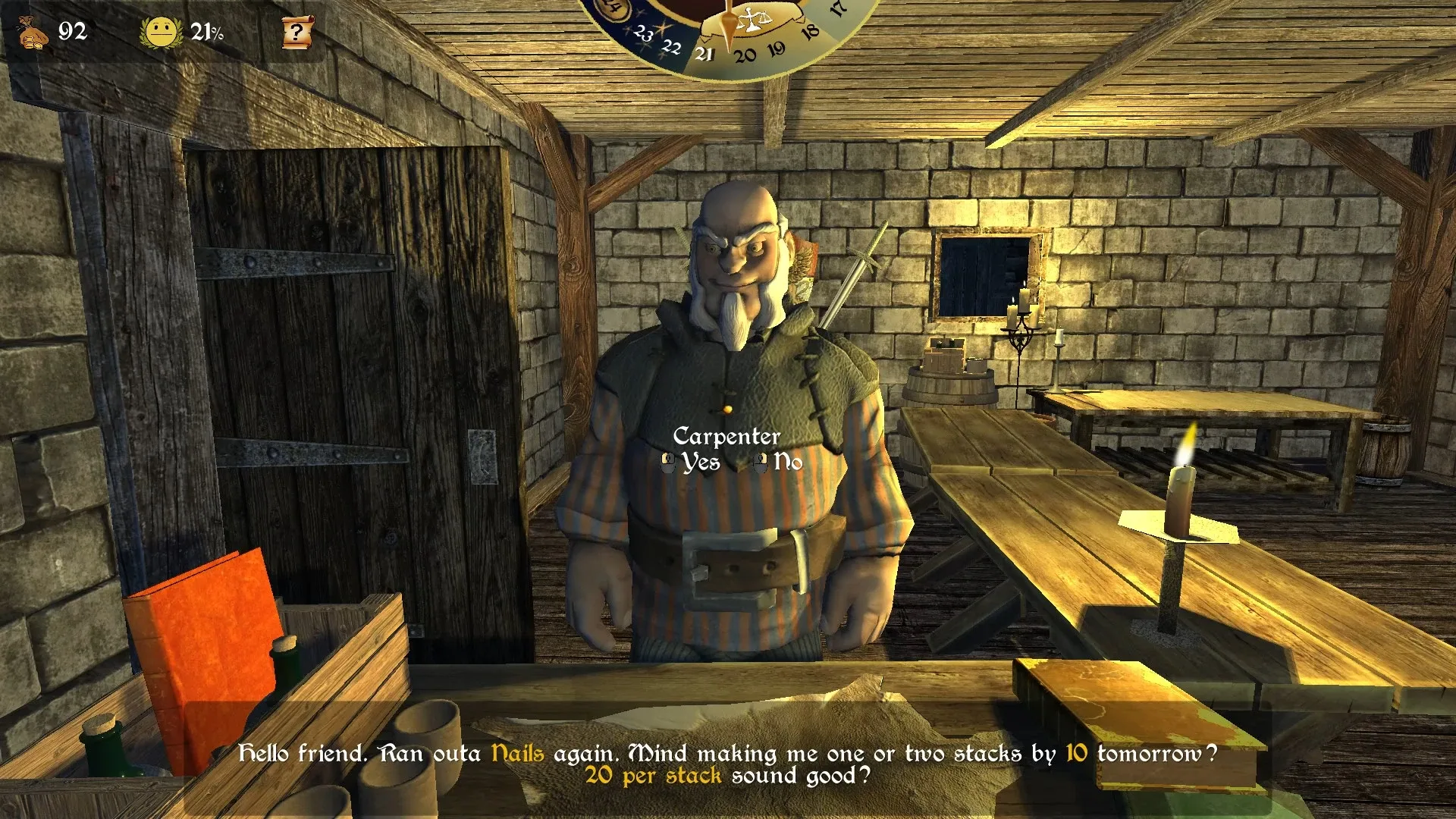 You own a smithy and the land around it. Gather resources outside or buy them when the trader visits and craft products to sell to customers. Some will have special requests for you, which will allow you to earn more money and also fame. Enough fame will make customers pay more money.