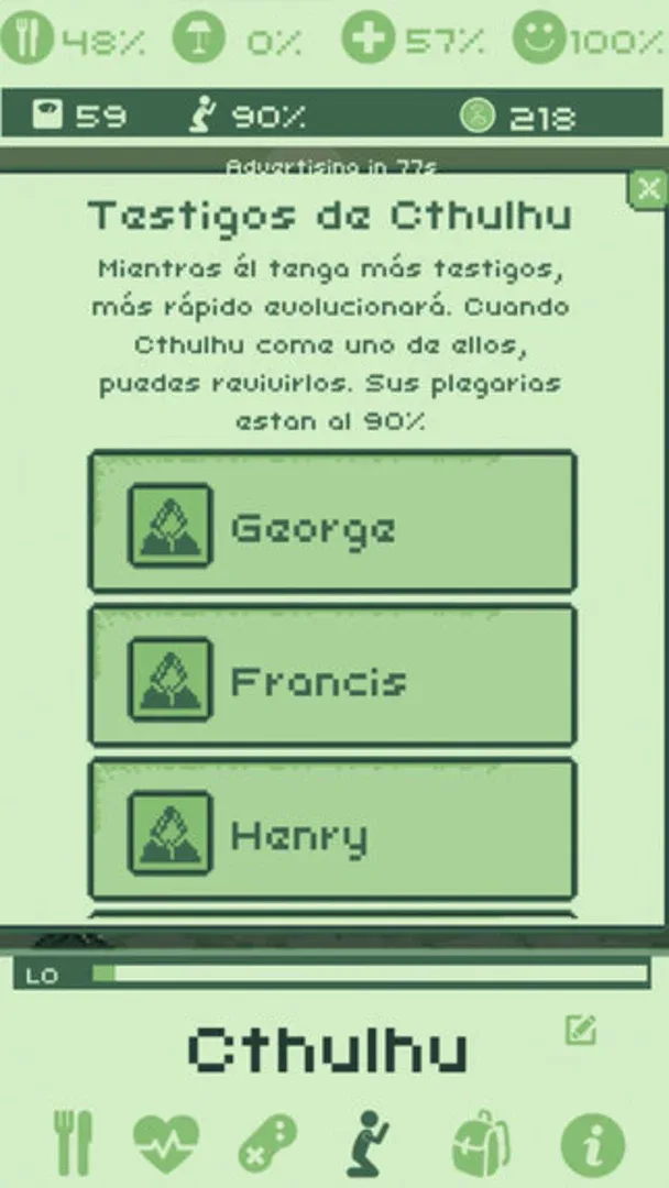 The stars just came right and it’s your turn to wake up the great God from his eternal dream to resume his rule on earth. Since you were the one who invoke him, you have to take care of him as if he were a new born, until he gets bigger and stronger again. For that purpose you have to feed, entertain, clean, bath him and prevent him form getting angry because he’ll start to eat his witnesses. If none is left he´ll fall into the eternal dream one more time and you’ll have to wait for the stars to be right again to wake him up.
