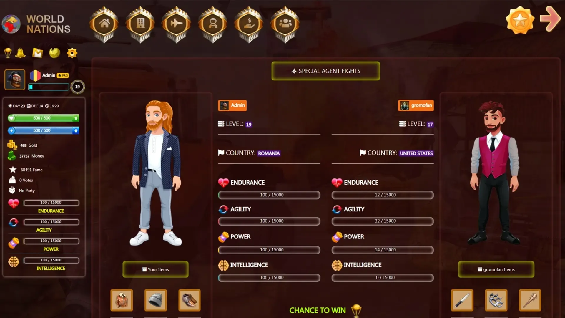 World Nations Game is an online MMO game in which you can have your own virtual life. You can join a nation, buy vehicles, items, properties, open a political party, fight in international battlefields, participate in races, take part in special agent fights between agents from other countries, attack other citizens space colonies on any country map, be a nation senator or president, be part of the world congress, vote on nation issues and you can do many other activities.