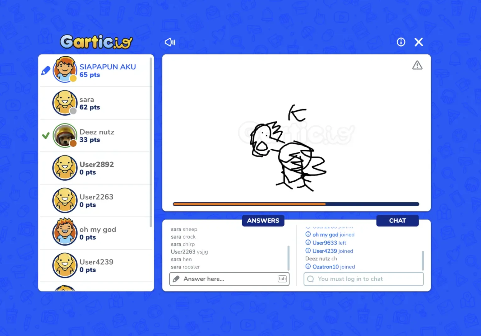 Welcome to Gartic.io! Playing Gartic.io you are gonna have fun guessing and drawing! Every round a Player is chosen to draw something for the others to guess what it is. The first player to achieve the goal of points will be declared the game winner. Choose between one of the groups of words that we offer and have fun with your friends! Gartic also allows the player to create his own room and invite up to 50 friends sharing a link to the room. Choose one between the different room subjects to draw and have fun!