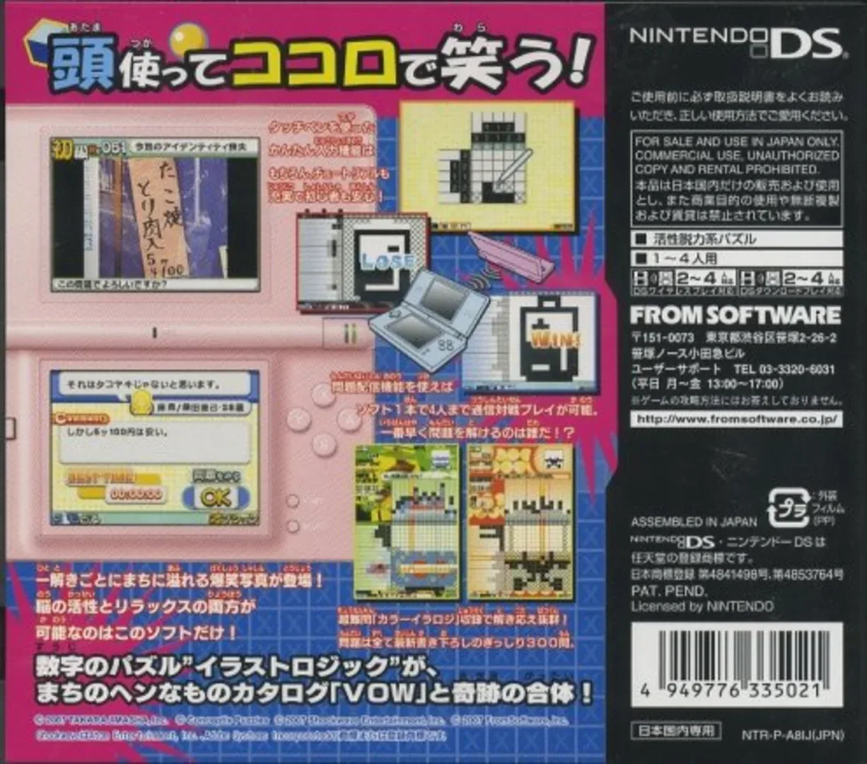 Nanpure VOW is a picross puzzle game containing 300 B&W Pic-a-Pix and Color Pic-a-Pix puzzles in all difficulty levels. The game also has multi-player games for up to 4 participants.