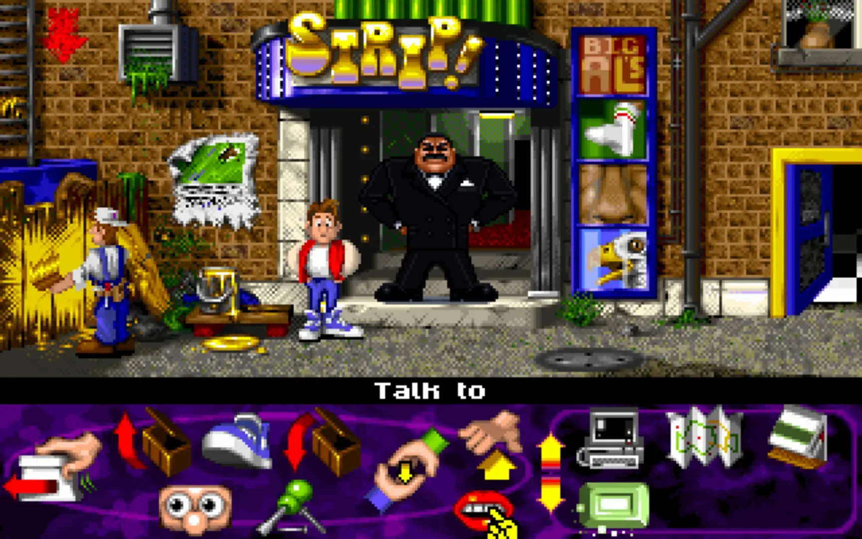 Bud Tucker in Double Trouble is a point & click adventure where the player explores and uncovers clues in a town called Barryville. The game play consists of picking up items and using it when necessary. The player can perform various actions (pick up, use, etc) which can be displayed in words as well as icons, The game is divided into three parts beginning with Bud Tucker locked up in a crumbly hotel in Seedy Street.