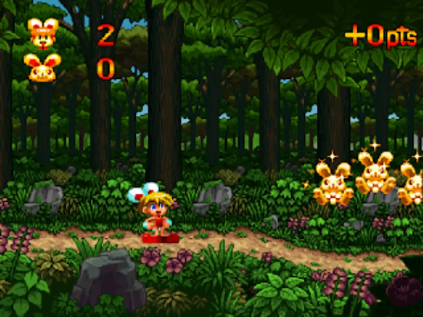 Keio Flying Squadron 2 was released in 1996 for the Sega Saturn in Japan, Europe, and Australia. The second installment of the series continues the story of Rami's adventures as the Keeper of the Secret Treasure (a sphere passed down through generations of Rami's family). Rami races Dr. Pon and a new rival Himiko Yamatai for an ancient treasure that can be unlocked with six spheres. Two of the stages retain the shoot-'em-up style of the first game, but the lesser dragons can be obtained as bonuses only. Mainly the stages consist of sidescroling platformer stages. These scroll from right to left on the Japanese version and left to right on all other versions. Several bonuses can be collected including three weapons (Rami can also bounce on the heads of enemies to defeat them): A large mallet, used only for hitting enemies An umbrella, used to hit enemies, float and deflect overhead obstacles A bow, used to shoot arrows at enemies. Besides the platformer and shoot-'em-up stages, there is vertically scrolling special stages, an underwater stage and a rollercoaster stage, making the game a multi-genre platformer. Points spheres can be collected throughout the game. A reward system accessed from the main menu unlocked helpful hints and behind-the-scenes extras depending on the highest and lowest scores achieved through playing.
