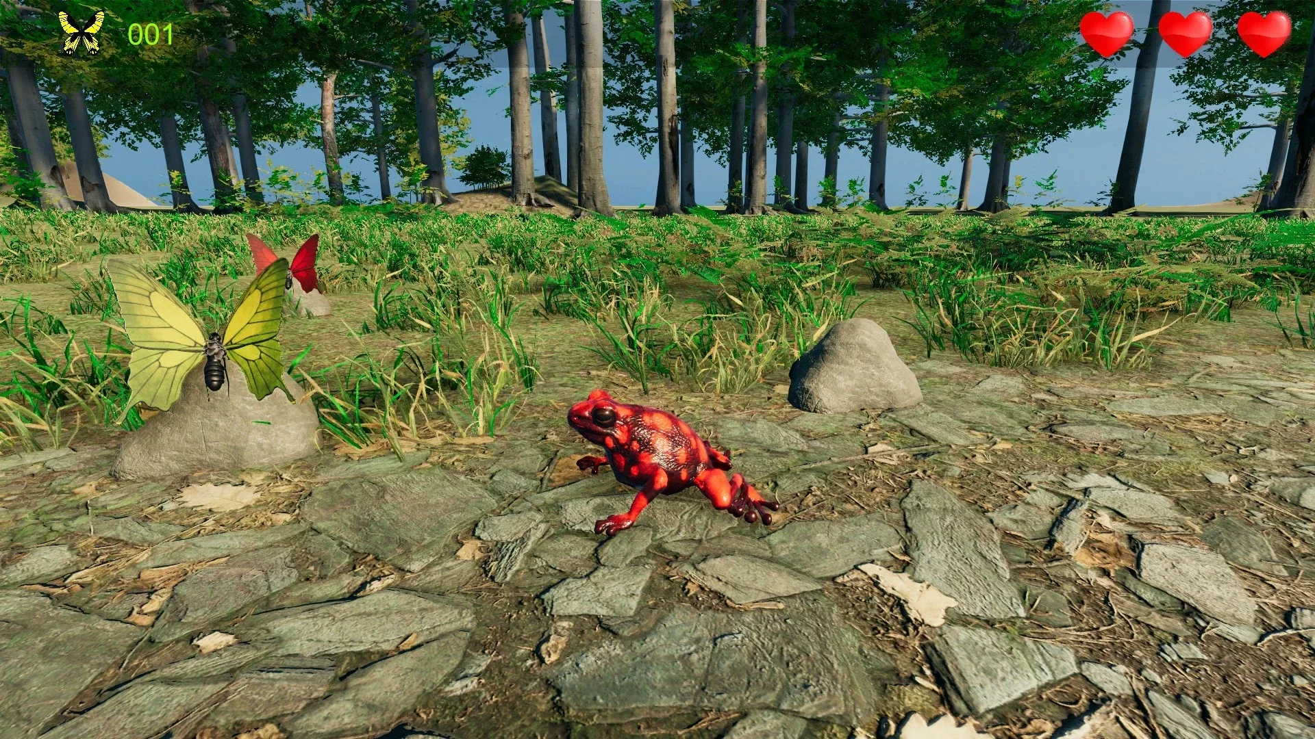 Whole game is about eating butterflies. Player controls frog which can move and jump around environment. Player can eat nearby butterflies, but careful, there are some butterflies which are poisonous for frogs and after eating them, player looses one of his three lives. If player dies game is over and player must start again. In game are no time limits, game suppose to be funny and relaxing.