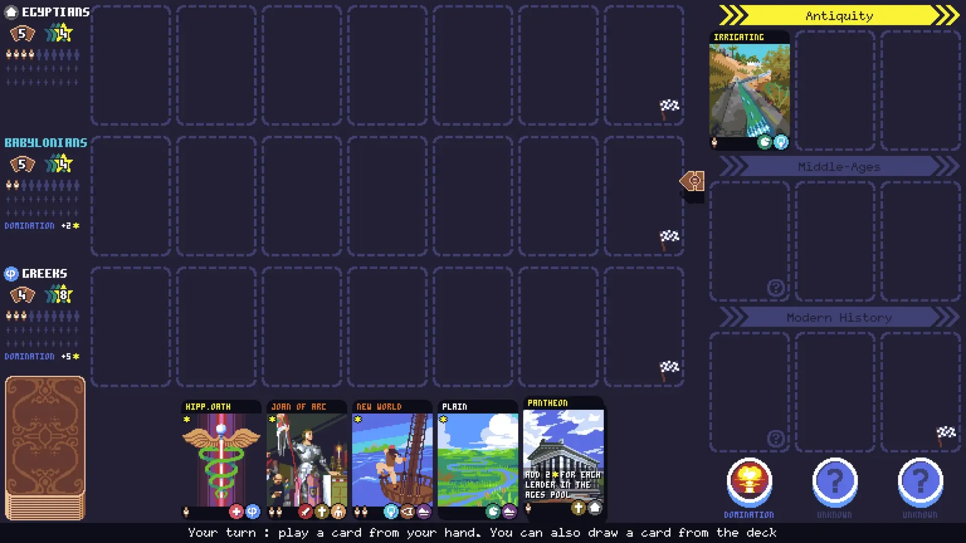 Rush for the Ages is a quick card game about outplaying your two opponents while rushing through the ages to unlock new possibilities. Find the best synergies between the different cards and compete for the prestige tokens uncovered as the game advances. But as soon as any player sets down a 7th card in their timeline, the game ends and a winner is sanctified.