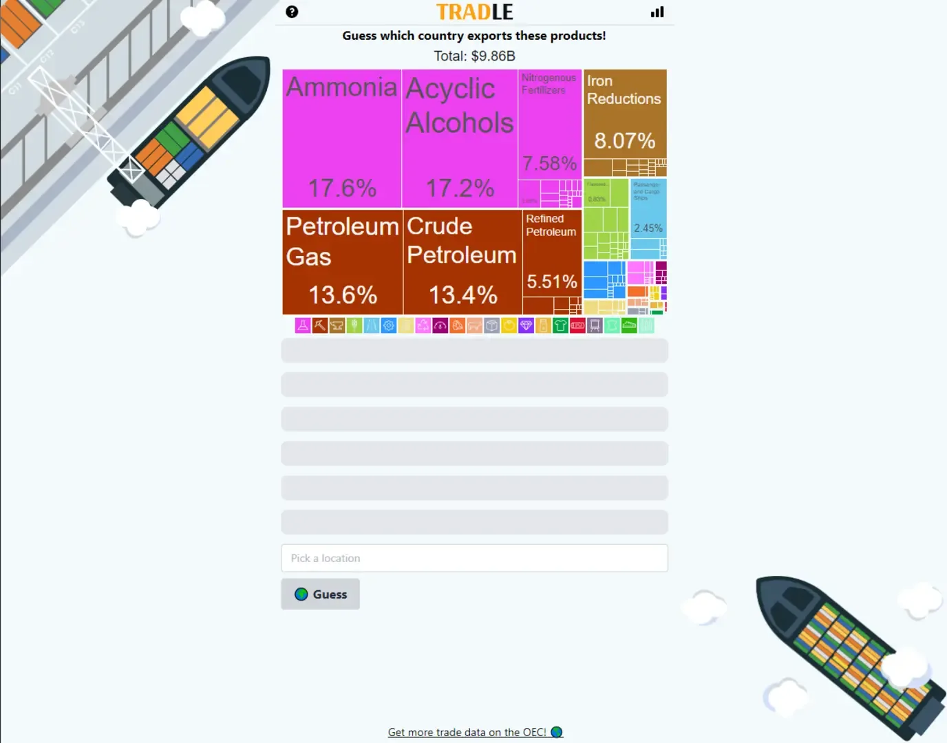 A daily geography guessing game, where players are initially given data about a country's exports to assist in guessing the correct country.
