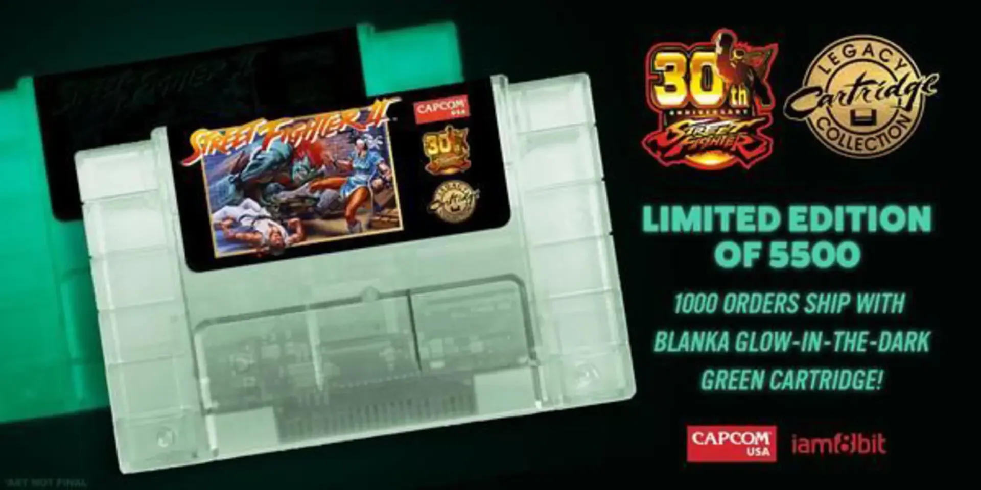 The 30th Anniversary Edition of Street Fighter II published by iam8bit is the original game on a brand-new playable SNES cartridge in a tri-fold box w/ foil, gloss and embossments. Limited to a total of 5500 copies, of which 4500 copies come in Opaque Ryu Headband Red and 1000 copies come in Translucent, Glow-in-the-Dark Blanka Green. The original manual has been worked over and includes mini posters. The tri-fold packaging doubles as a mini poster when opened up.