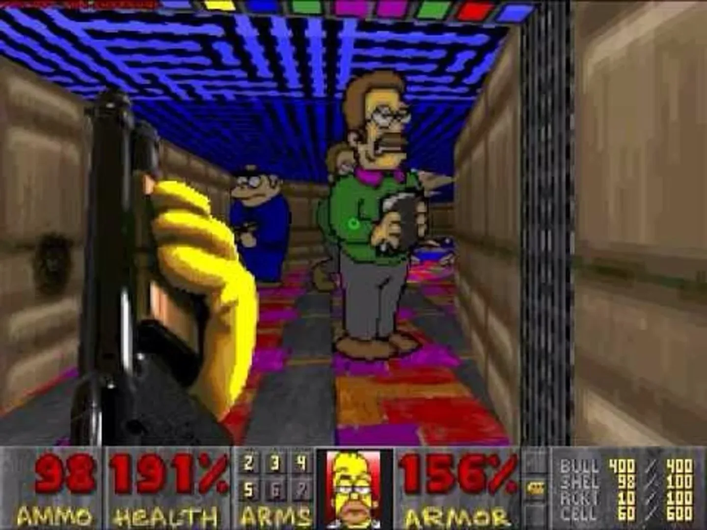 The Ultimate Simpsons Doom is a graphics and sound mod made by Myk Friedman & Walter Stabosz and released in 1998. In the modification, you play as Homer Simpson killing evil clones of his friends, family, neighbors, and co-workers (they replace the normal monsters). As it only replaces graphics and sounds it can be used with either Doom or Doom II.
