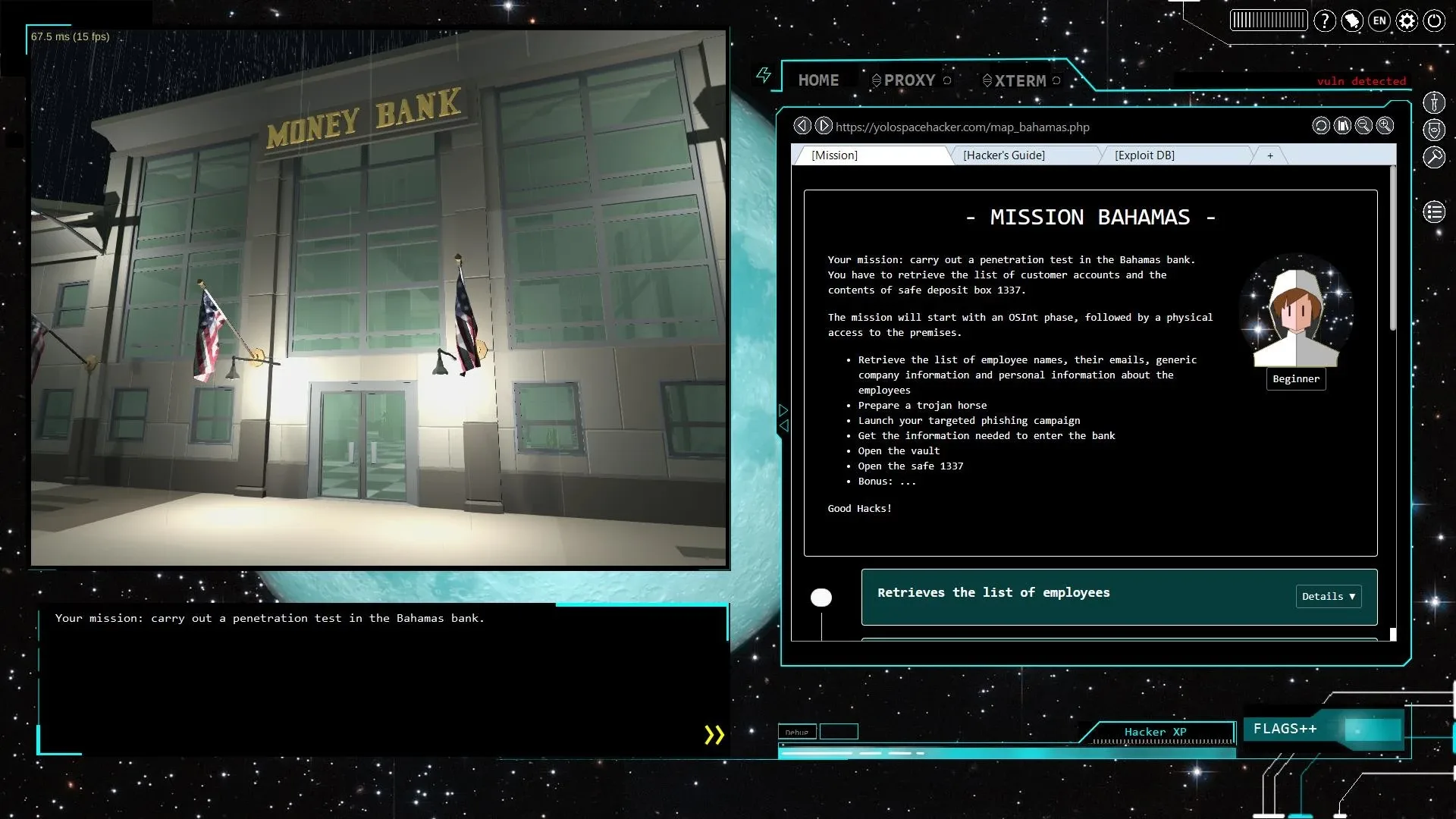 Carry out an intrusion test within the Bahamas bank. You will have to sharpen your OSInt skills, prepare a trojan, and carry out targeted phishing to penetrate the bank, and open the safes in all discretion, and in all legality...