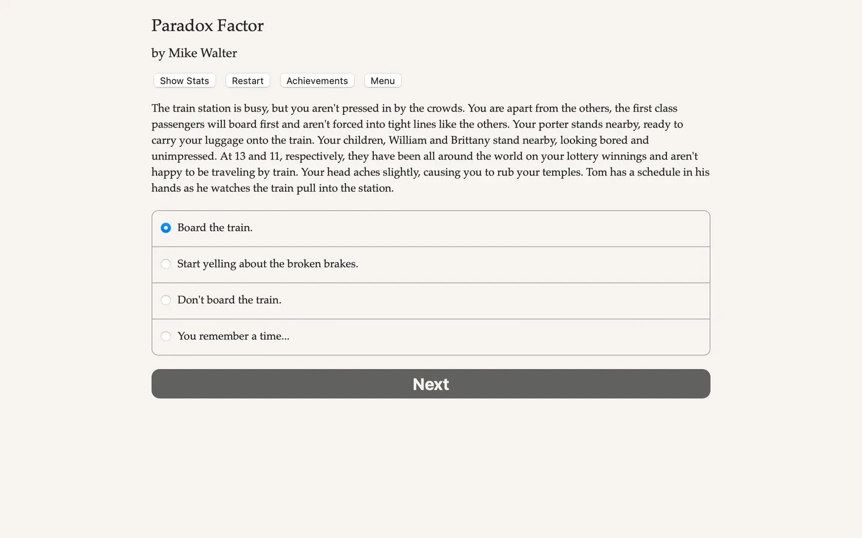 Paradox Factor is a 30,000 word interactive science-fiction novel by Mike Walter where your choices determine how the story proceeds.