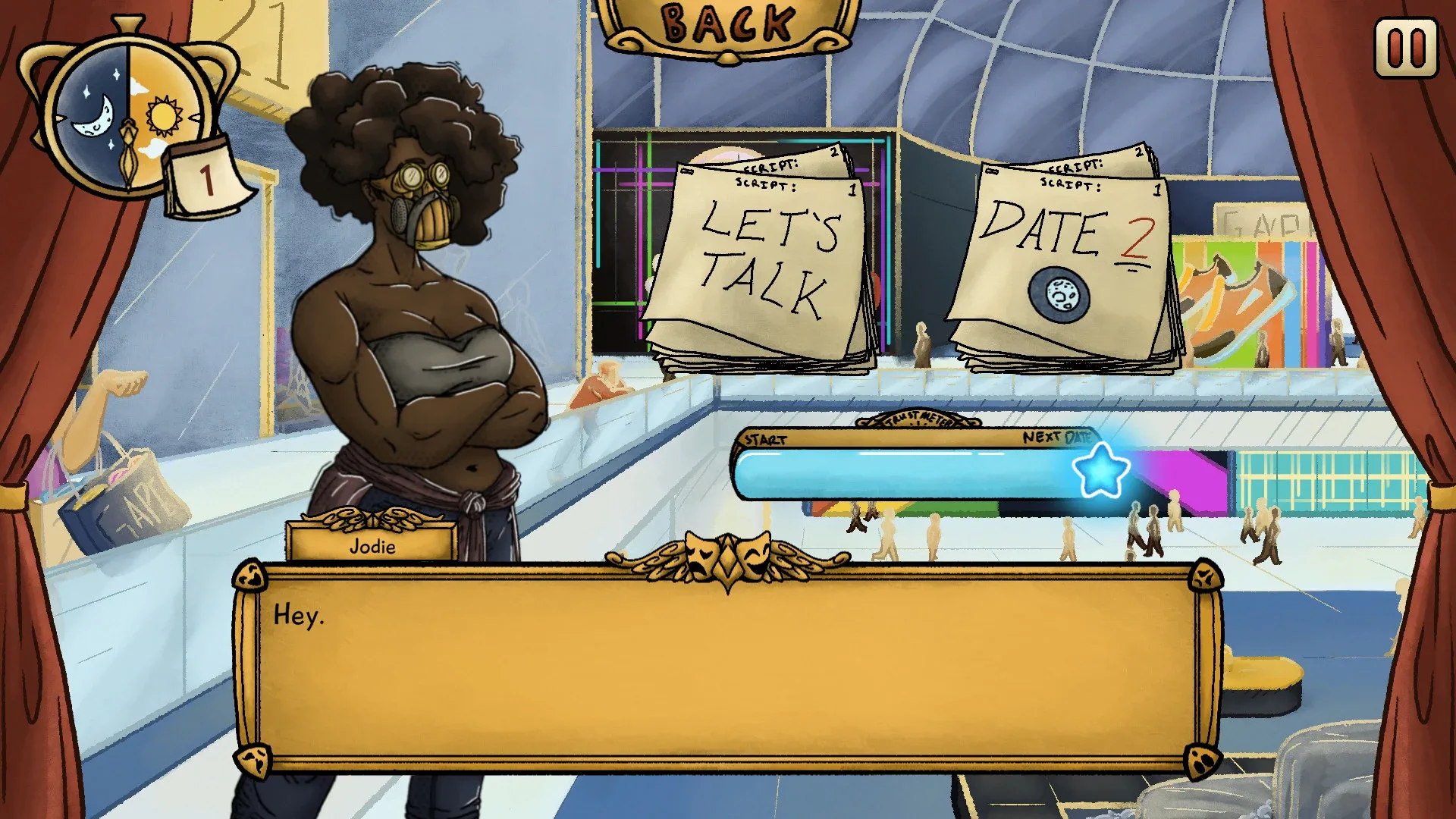 "Curtain Call" is a visual novel about (literally) breaking through social masks by forming meaningful connections with incredibly deep personalities. Whether you’re looking to make new friends or something more, there’s a whole cast of characters just dying to meet you!