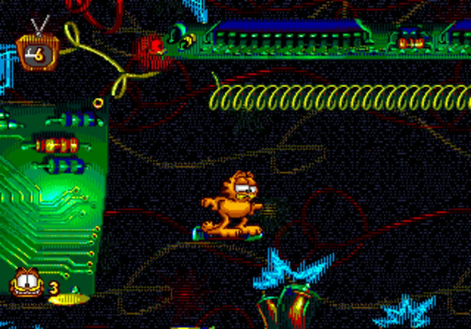 Odie scares Garfield while they are watching television and they fall on the TV, breaking it. Both characters attempt to repair it before Jon Arbuckle catches them; however, the thrown spare parts become an electronic monster known as the Glitch, transporting Garfield into the TV. Players take control of the titular cat across levels of varying themes on the television in order to defeat the Glitch and escape the TV.