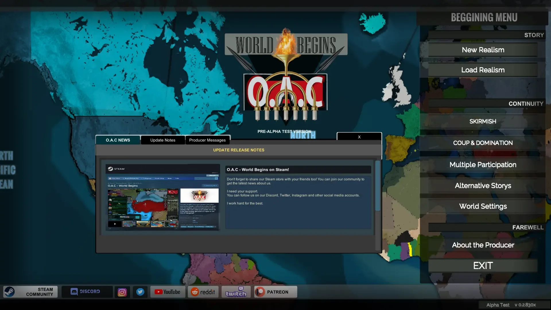 Are you a leader? Once you convince your nation you are their leader, it will be time to show the world your own political, people management and military strategy skills. O.A.C aims to be a breath of fresh air in the grand strategy genre that will inspire its own kind of videogames!