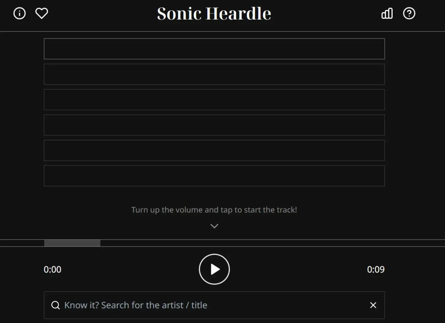 This is a clone of Joywave Heardle (which in turn was modeled on Heardle and K-Pop Heardle) that is focused on Sonic the Hedgehog. Each Sonic Heardle is randomly chosen from one of several songs from the franchise - mostly the games with a few from adaptations (like the OVA or SatAM) thrown in as well.
