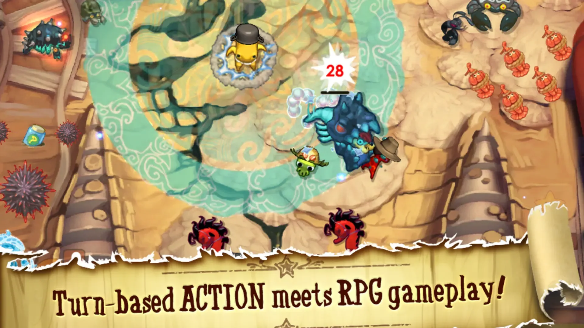Squids Wild West has a unique mix of action strategy and RPG: build your team of heroes for challenging turn-based battles against corrupted crabs and shrimp! This sequel is even better than the first game, with many surprises in store: devious new enemies, four new playable characters, and nearly twice as many levels.