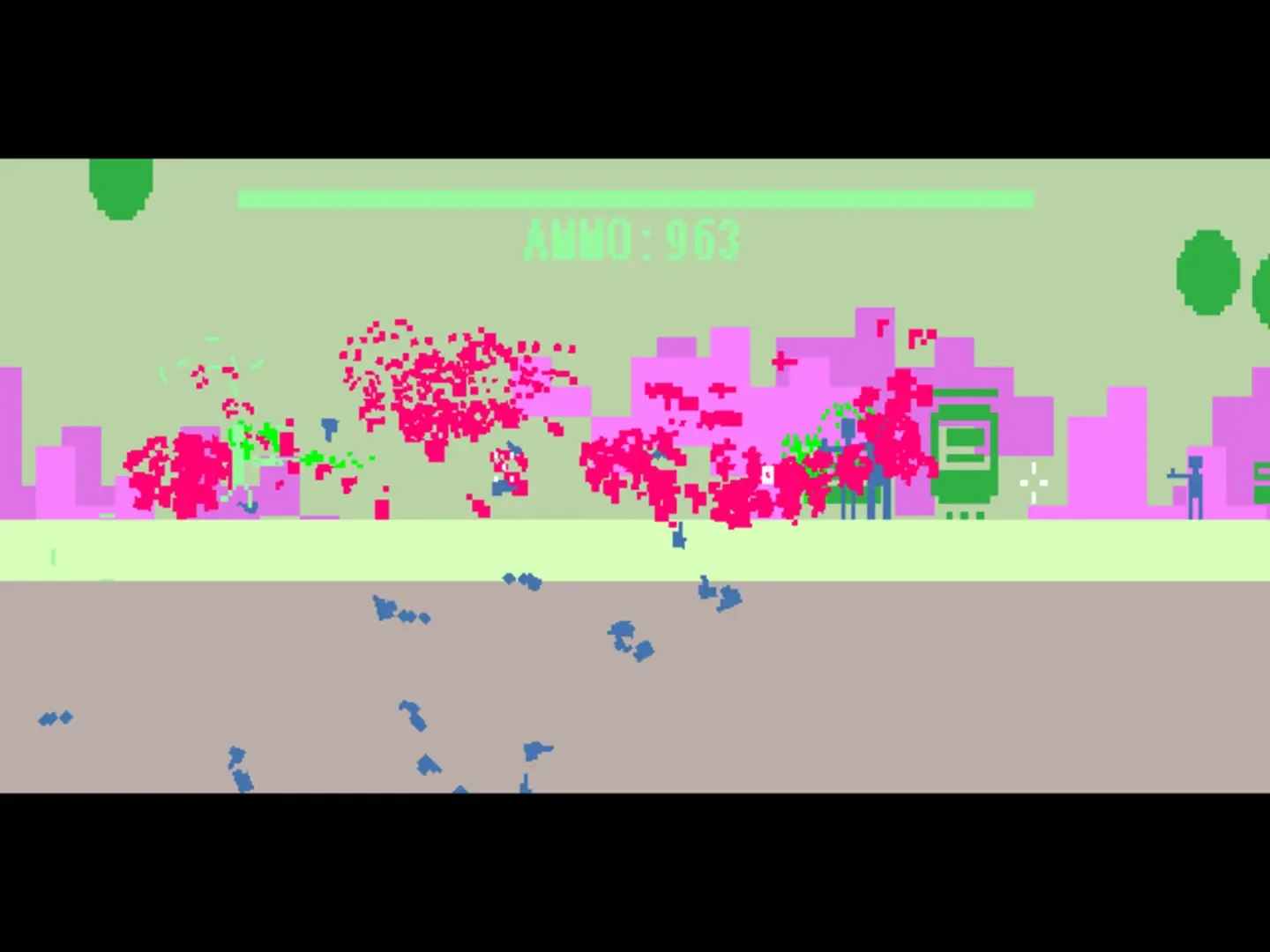 Stallions in America is an action game, where on each level the player, as one of the four gunmen called "Stallions", must massacre a crowd of people, bats and balloons on the loose in cities around the United States.