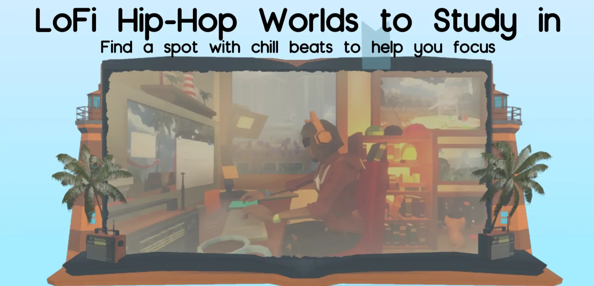 Welcome to a bunch of chill 3D worlds full of unique study spots with Lofi Hip Hop music and ASMR sounds. You can explore them to relax while you take a break from studying. When it's time to study again, you can set a timer and put these worlds in the background. Nothing is trying to hurt you. You don't need to fight anything to win. You set your own goals, and you can customize your own soundscape to help you meet them.