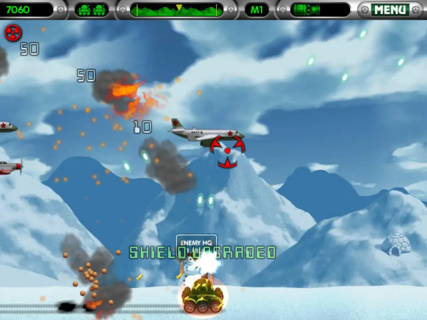 Heavy Weapon is a cartoonish side-scrolling action game where you control a single tank fighting waves of opponents. Driving to the right over flat terrain at a constant speed, the tank can move left or right while the sky is filled with aircraft such as jets, helicopters, zeppelins, bombers, and missiles. Projectiles need to be avoided or taken out. Some friendly planes will pass and drop power-ups to improve speed, gun power or shield, or provide nukes, rockets, a laser, rapid-fire, or spread fire. During each level, enemies will drop parts of a mega laser weapon. If the four parts are found, an extremely powerful laser beam is added to your arsenal for a short time.