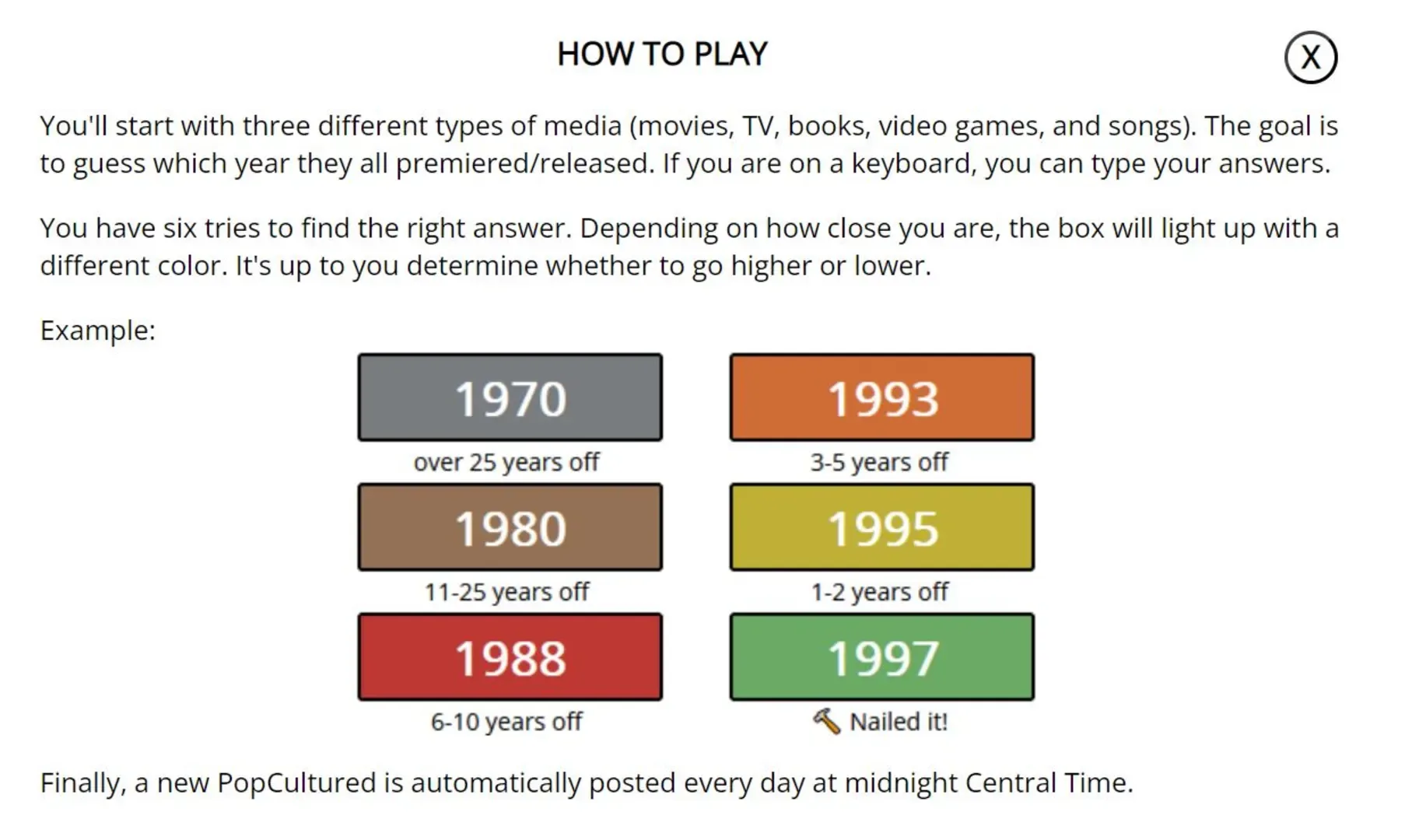 You'll start with three different types of media (movies, TV, books, video games, and songs). The goal is to guess which year they all premiered/released. If you are on a keyboard, you can type your answers. You have six tries to find the right answer. Depending on how close you are, the box will light up with a different color. It's up to you determine whether to go higher or lower.