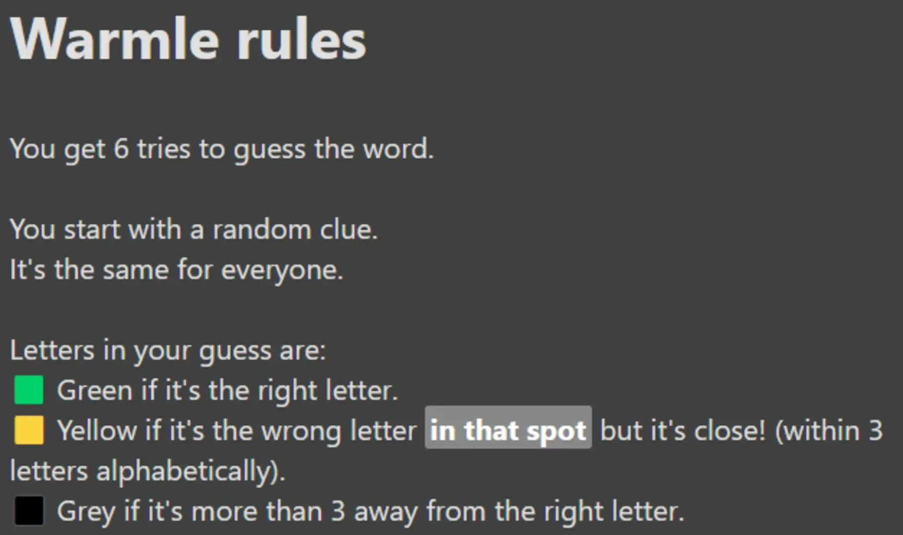A daily word guessing game where players must reach a target word by continually guessing valid words. Clues are given out based on how close in the alphabet each letter is to the target word's.