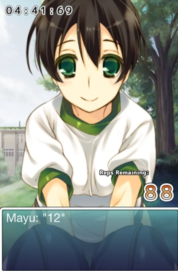 “Burn your fat with me!!” is a fitness app/dating sim that provides players with the motivation to work out through moé, a Japanese term describing that heart-melting feeling you get when you see an adorable female anime character. At its core, “Burn your fat with me!!” is a Japanese visual novel game akin to the “Phoenix Wright” or “Professor Layton” series. But instead of building a case or solving puzzles, the player advances the story by clearing fitness goals, such as performing 50 sit-ups in three minutes. The story revolves around the player’s relationship with childhood friend Mayu Uehara and is divided into 20 fully-voiced episodes*. Players train in real life by doing sit-ups, push-ups**, and squats with their iOS device while Mayu counts their repetitions and cheers them on. As the story advances, you become closer with Mayu but your fitness goals also become more demanding. Clearing the story may take several months of training, but stick with it and you’ll have something to show for in the real world as well!
