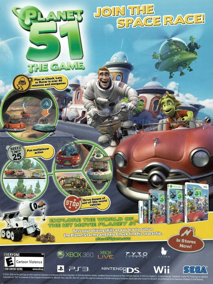 Planet 51: The Game is an action driving game, with some sandbox play, that can be described as Grand Theft Auto for kids. It is based on the animated movie with the same name. You will play as Lem (the young green alien), Charles 'Chuck' Baker (the stranded astronaut) or R.O.V.E.R. (the mechanical probe), in their joint effort to help the astronaut in getting back to the Earth. The game has three acts, divided in 40 missions. You'll have to race, crash the cars, escape from the villains, find hidden rocks, transport goods, mow the lawn, etc. Throughout the course of the game, you can unlock rewards and gain achievements by completing missions in a set amount of time or without breaking the car, finding all the secret comic pages, performing jumps through billboards, etc. The game supports multiplayer action in crashing cars and races, for 2 to 4 players, depending on the platform.