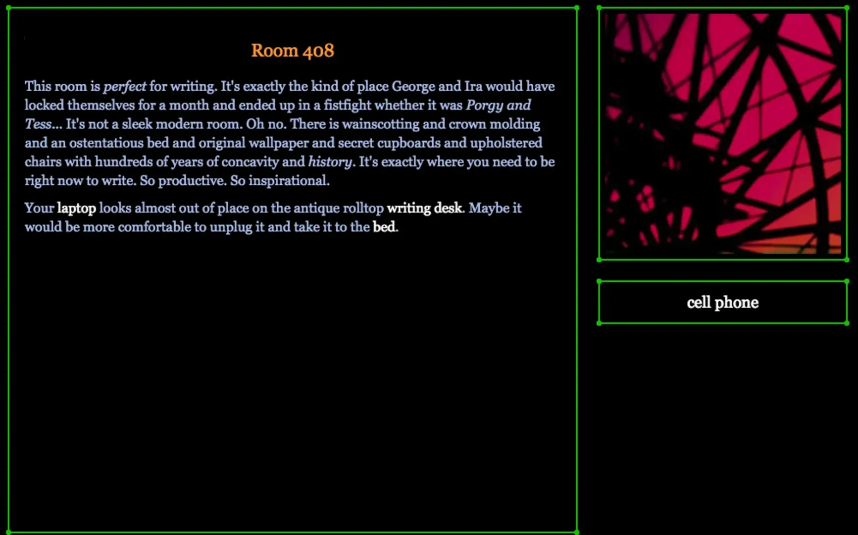 Hell, even a seagull would hit the spot right now, roasted crispy over a flame-- He immediately put all thoughts of food out of his head because at the moment it was just torture_ A work of interactive fiction by Hanon Ondricek.