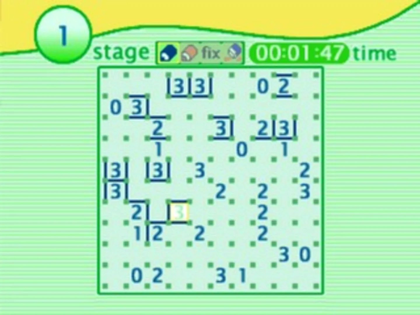 Slitherlink (also known as Fences, Takegaki, Loop the Loop, Loopy, Ouroboros, Suriza and Dotty Dilemma) is a logic puzzle developed by publisher Nikoli. Slitherlink is played on a rectangular lattice of dots. Some of the squares formed by the dots have numbers inside them. The objective is to connect horizontally and vertically adjacent dots so that the lines form a simple loop with no loose ends. In addition, the number inside a square represents how many of its four sides are segments in the loop. Other types of planar graphs can be used in lieu of the standard grid, with varying numbers of edges per vertex or vertices per polygon. These patterns include snowflake, Penrose, Laves and Altair tilings. These add complexity by varying the number of possible paths from an intersection, and/or the number of sides to each polygon; but similar rules apply to their solution. SuperLite 1500 Series - Slither Link is a puzzle game based on the Slitherlink logic puzzle featuring over 200 different stages.