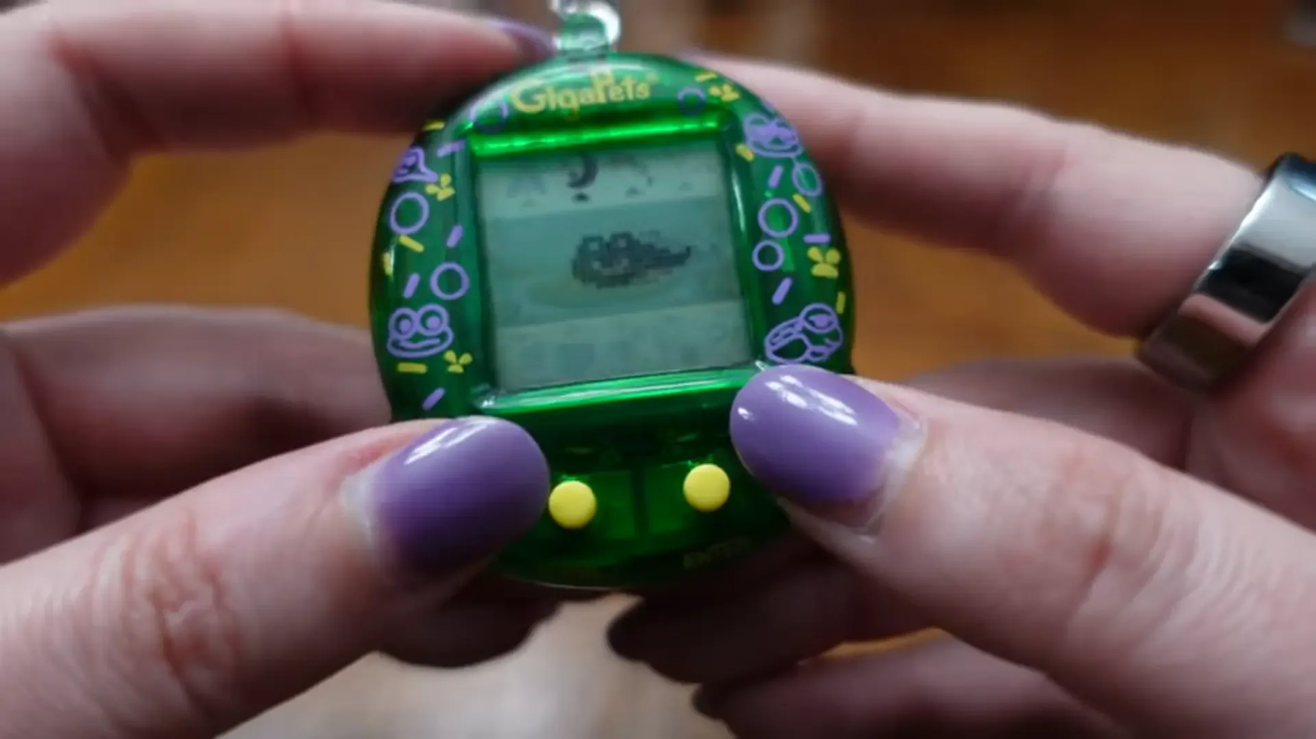 Giga Pets are digital pet toys. Available in a variety of different characters, each Giga Pet is a palm-sized unit with an LCD screen and attached key ring. To ensure a happy, healthy pet, its owner has to take care of it similar to how one might care for a real animal, including feeding, cleaning, and playing with their Giga Pet.