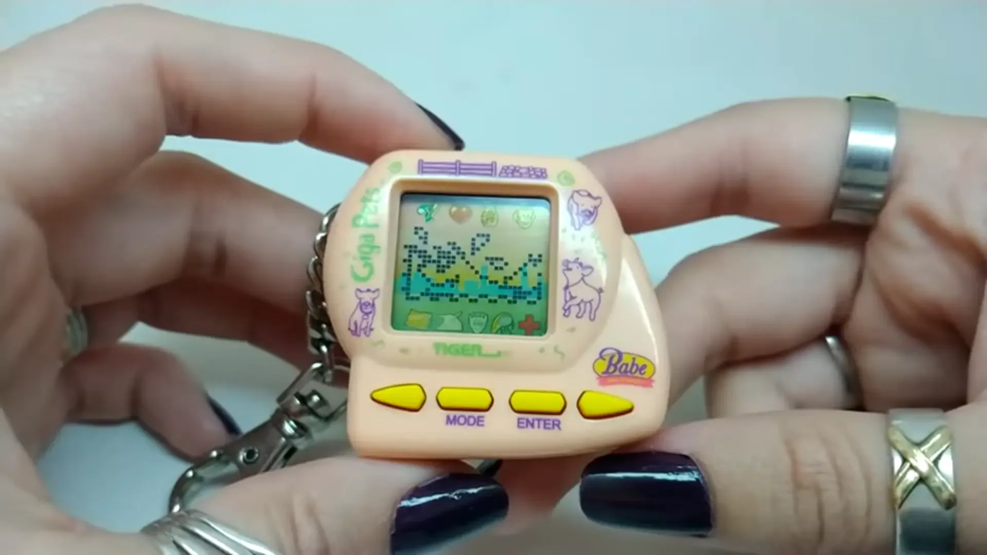 Giga Pets are digital pet toys. Available in a variety of different characters, each Giga Pet is a palm-sized unit with an LCD screen and attached key ring. To ensure a happy, healthy pet, its owner has to take care of it similar to how one might care for a real animal, including feeding, cleaning, and playing with their Giga Pet.