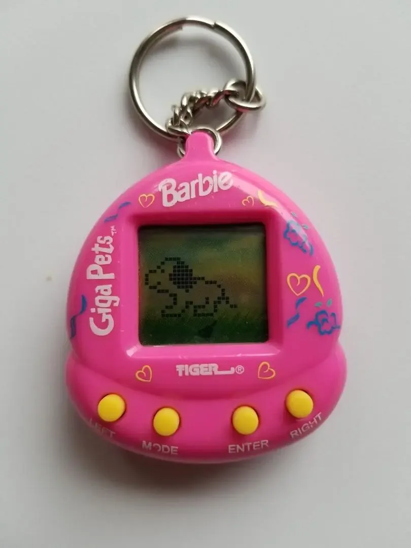 Giga Pets are digital pet toys. Available in a variety of different characters, each Giga Pet is a palm-sized unit with an LCD screen and attached key ring. To ensure a happy, healthy pet, its owner has to take care of it similar to how one might care for a real animal, including feeding, cleaning, and playing with their Giga Pet.